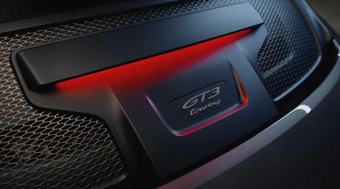 車尾部分,新車取消了普通版GT3上的鵝頸式擾流板,並更換成了可電控自動伸縮式的擾流板,整體感覺更加低調。此外貫穿式尾燈組、尾部擴散器、中置雙出的運動型排氣都一應俱全,並在後機艙蓋中間標有「GT3 Touring」的字樣,以表明新車身份。